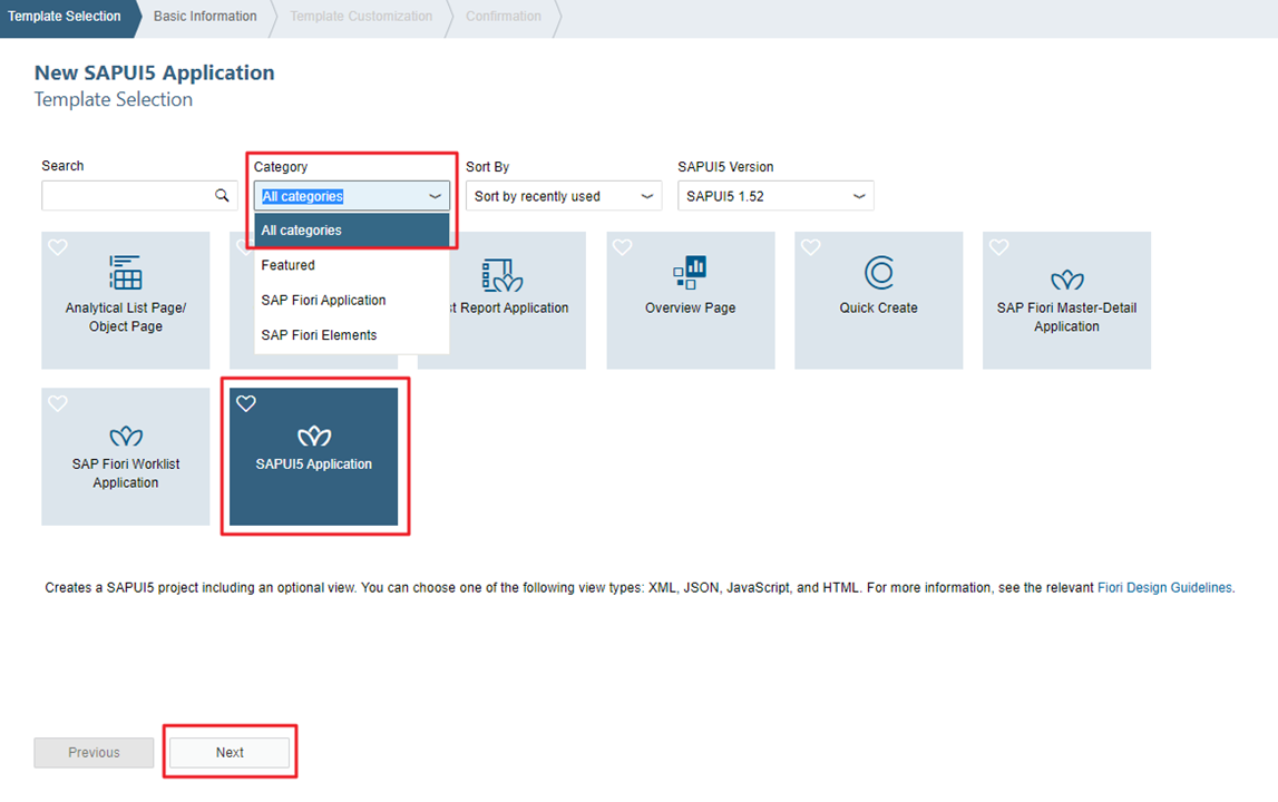 전체 사용 가능한 Template들이 보여지며 이 중 SAPUI5 Application 을 선택 합니다.