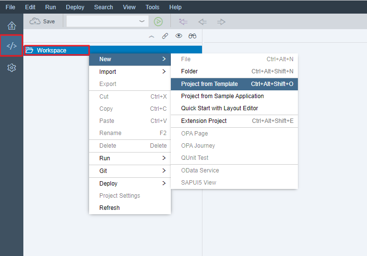화면 좌측 </> 클릭 > workspace 우클릭 > New > Project from Template 실행.