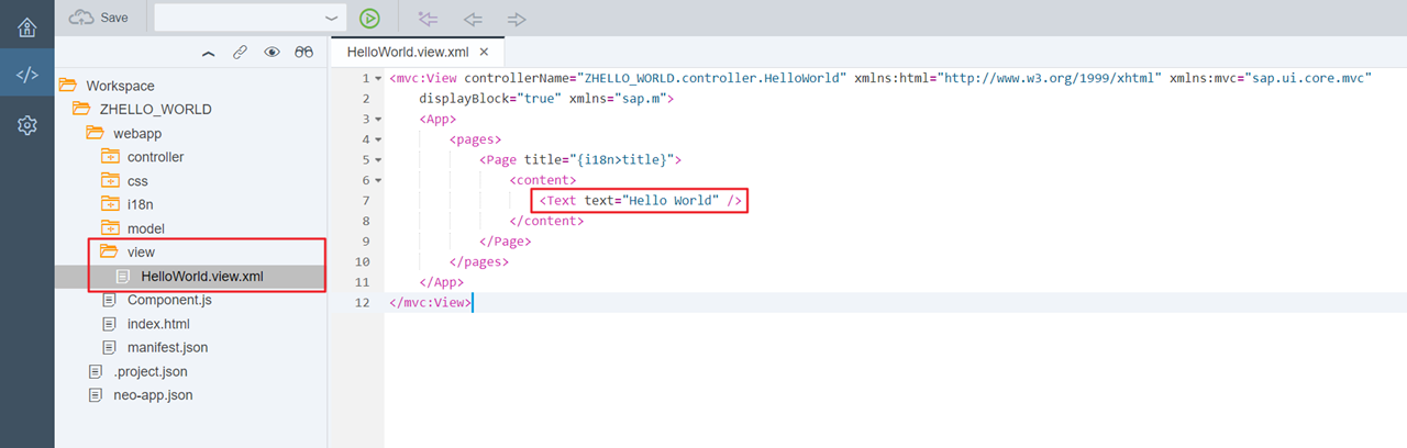 1) 경로 : Workspace > ZHELLO_WORLD > webapp > view > HelloWorld.view.xml 로 이동합니다.
