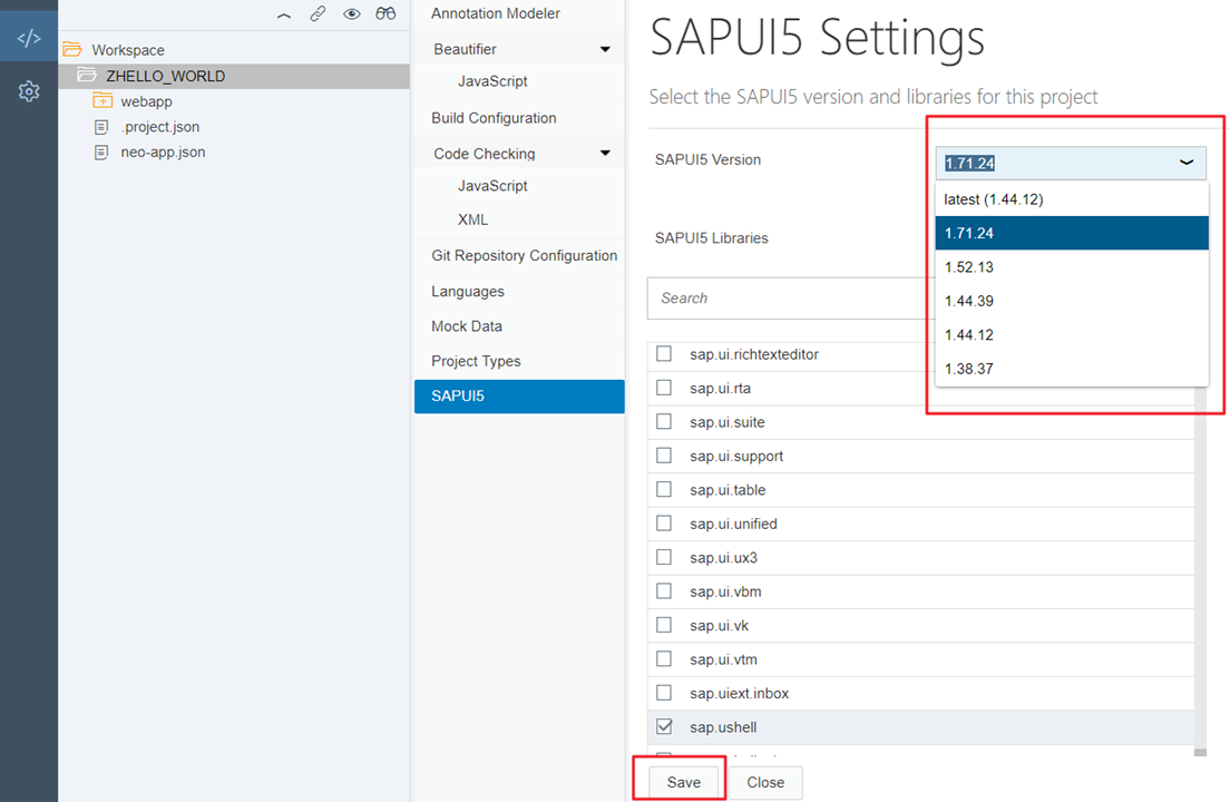 3) SAPUI5 버전 항목에 1.71.24 버전 확인 후 SAVE 버튼을 눌러 저장합니다.