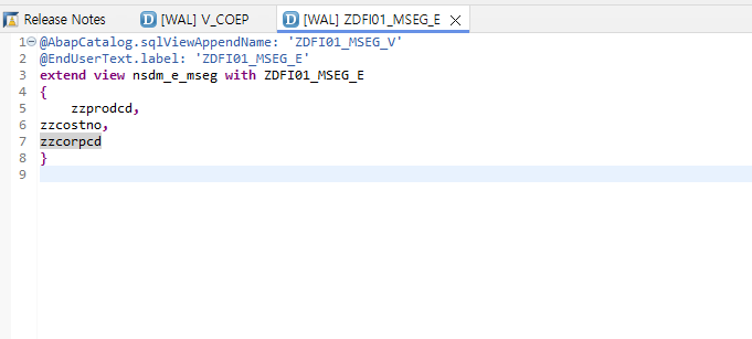 MSEG 테이블에 연결된 CDS VIEW는 MATDOC 테이블을 검색하는데 코딩블록의 위치가 상이하여 오류가 발생하는것이니 EXTEND VIEW를 만든다