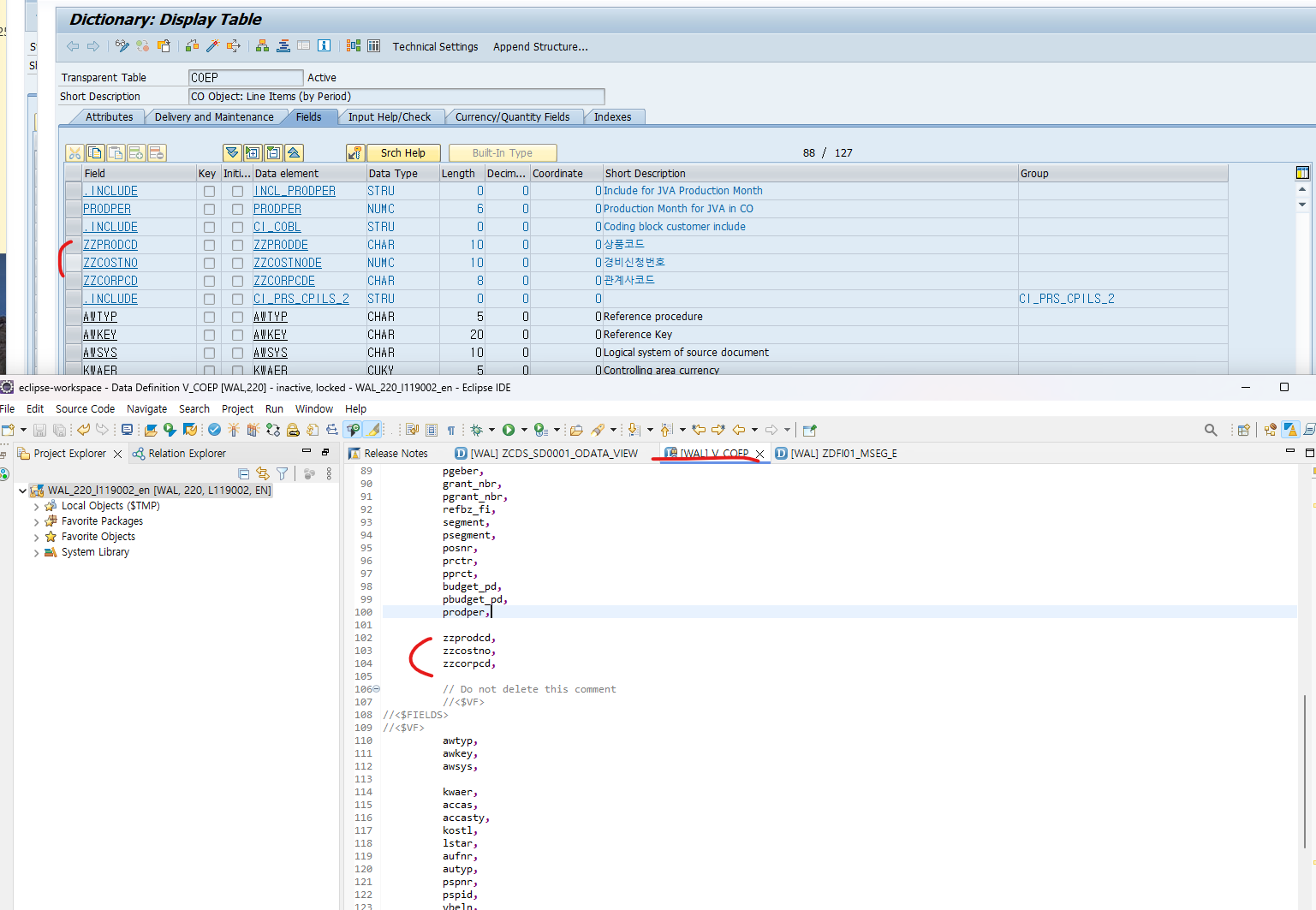 COEP와 테이블을 비교하여 Custom field추가되어야 하는 위치에 필드를 추가한다.