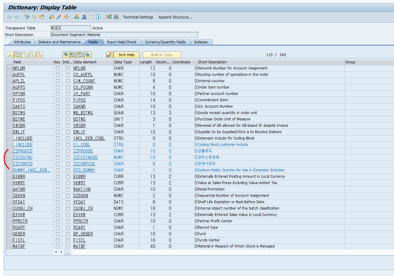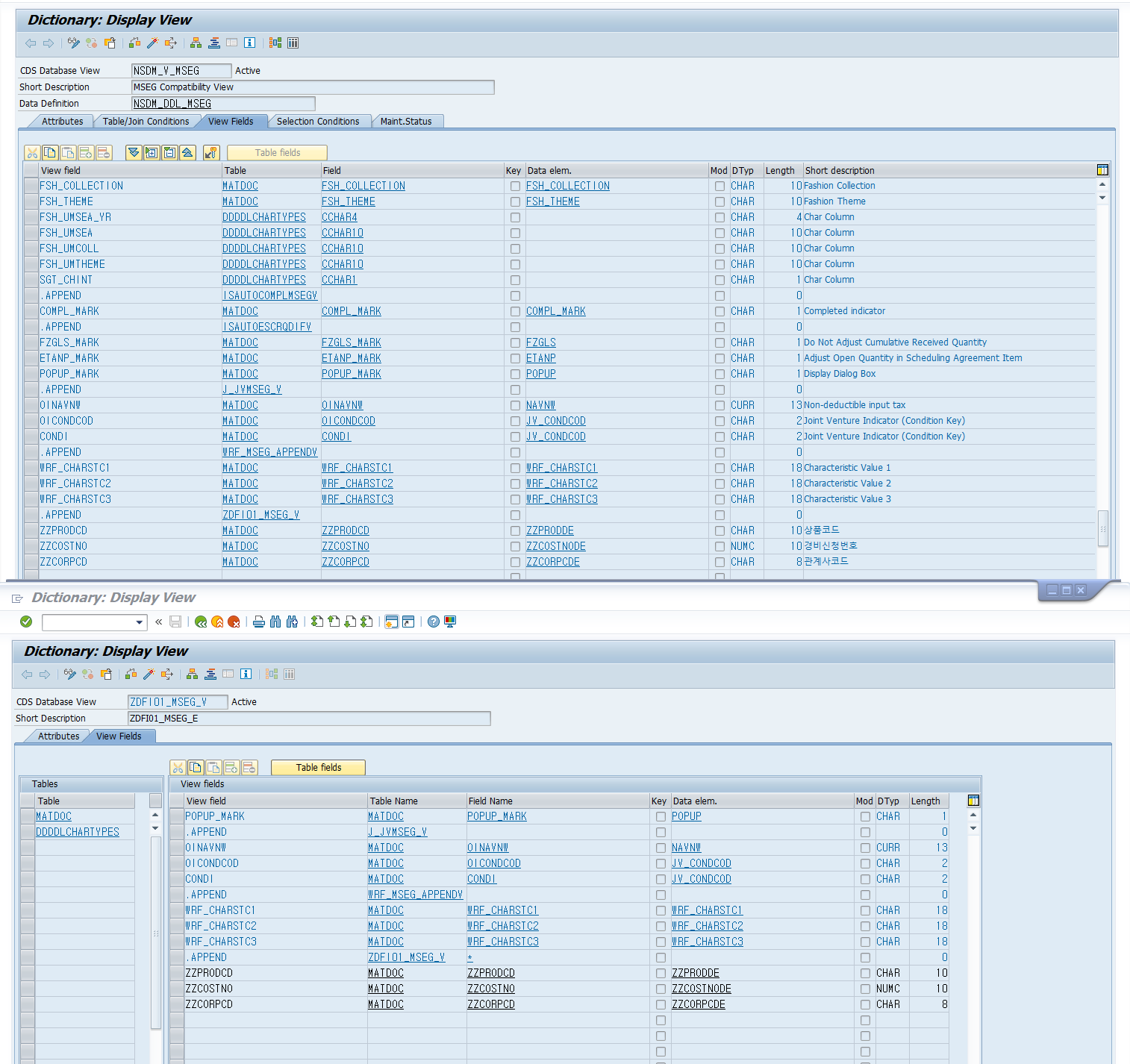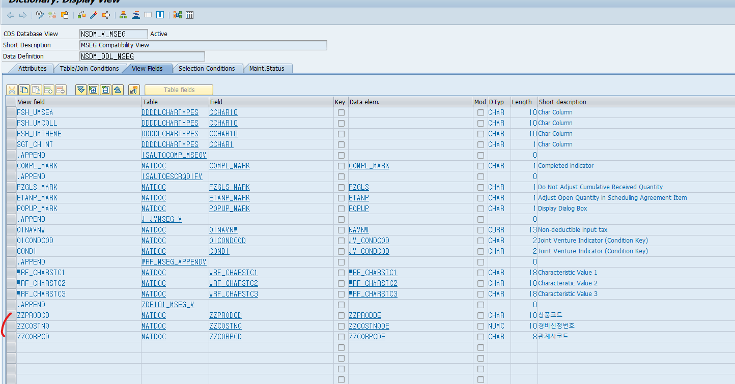 mseg쪽은 코딩블록 필드는 테이블 끝에 붙이는게 아니라 테이블 중간에 붙기 떄문에 cds view와 위치가 상이하여 컬럼불알치가 발생한다.